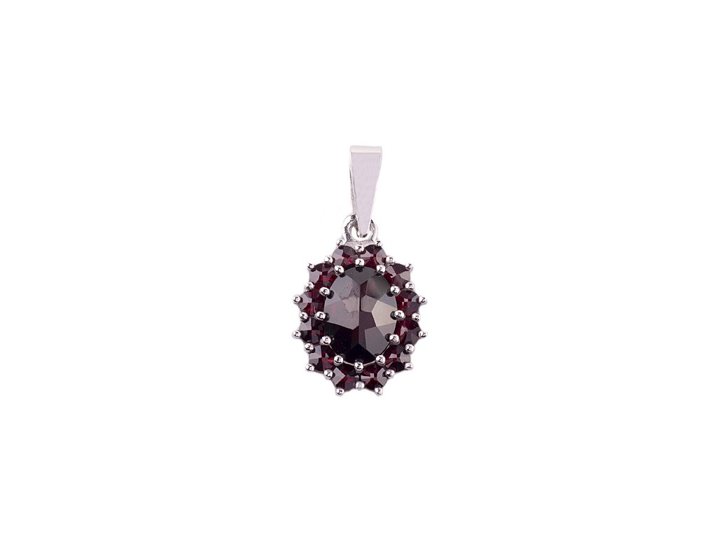 Tento elegantní přívěsek je vyroben ze stříbra (Ag 925/1000) s povrchovou úpravou rhodiováním. Zdoben je českými granáty a almandinem. Přívěsek má motiv ovál o velikosti 10x13 mm.