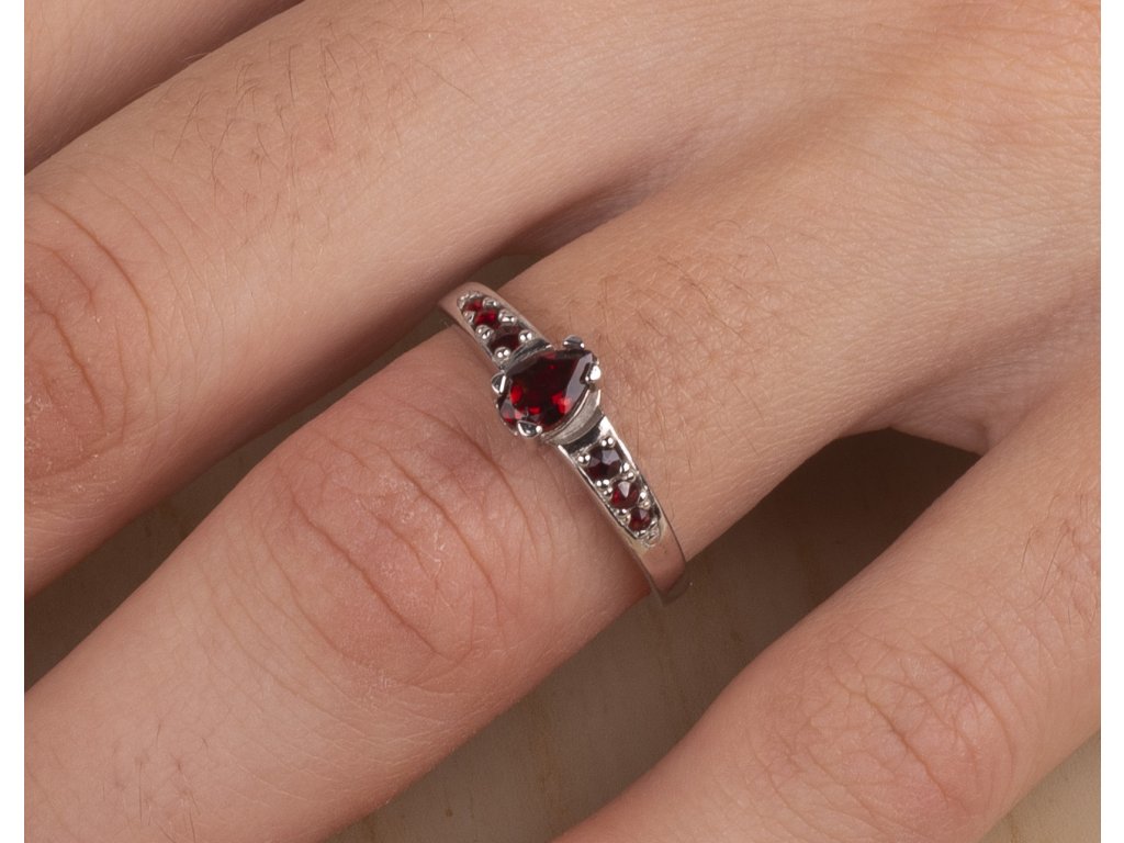 Tento dámský prsten je vyroben ze stříbra (Ag 925/1000) s povrchovou úpravou rhodiováním. Zdoben je drobnými přírodními granáty. Prsten má motiv kapka o velikosti 6x18 mm.