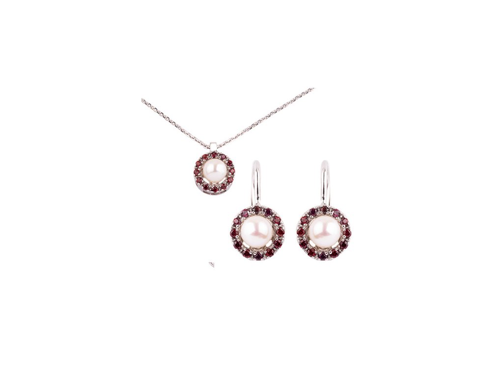 Tato dámská souprava je vyrobena ze stříbra (Ag 925/1000) s povrchovou úpravou rhodiováním. Zdobena je drobnými přírodními granáty a perlou. Souprava má motiv perla o velikosti 9x9 mm. Souprava obsahuje náušnice a náhrdelník.