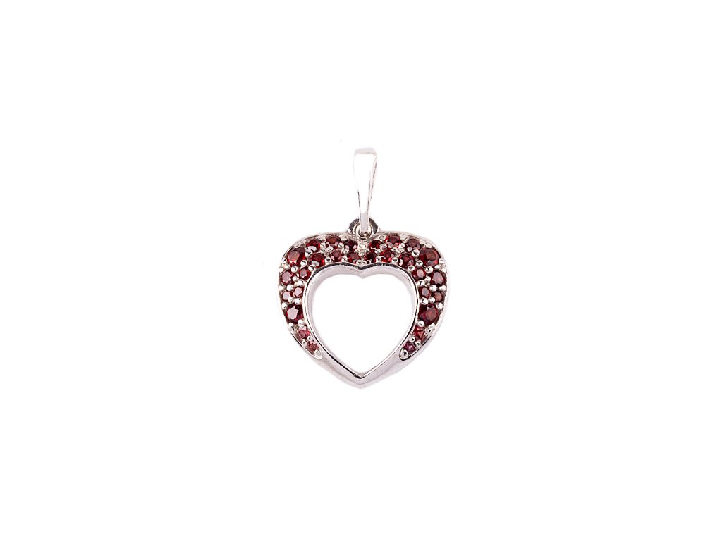 Tento elegantní přívěsek je vyroben ze stříbra (Ag 925/1000) s povrchovou úpravou rhodiováním. Zdoben je drobnými přírodními granáty. Přívěsek má motiv srdce o velikosti 16x15 mm.